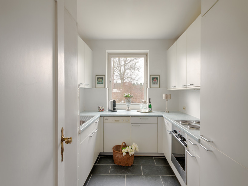 - weiße Küche in U-Form mit praktischem kleinen Abstellraum