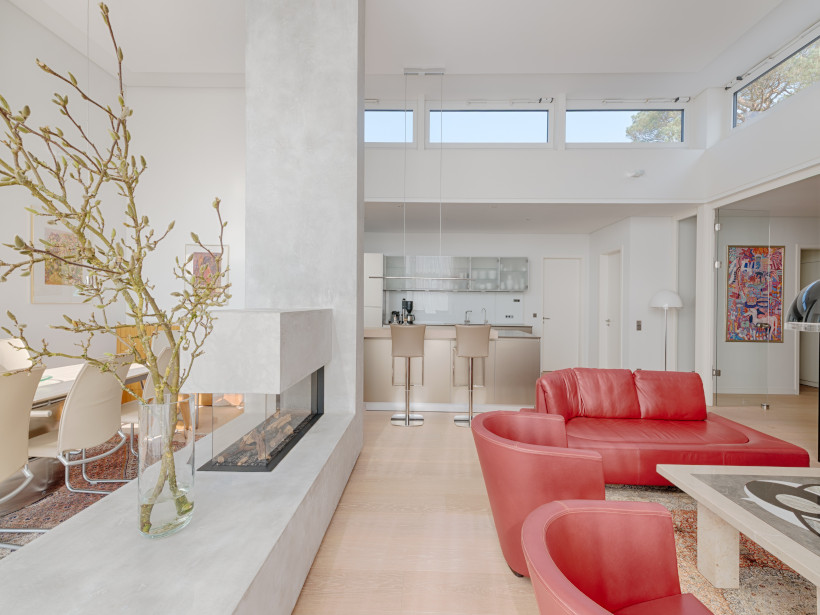 Klare und geometrische Formen gekonnt kombiniert mit Materialien wie Glas, Holz und Beton sowie gespachtelte weiße/ leicht getönte Wände zeigen die einzigartig moderne Eleganz dieser imposanten Penthouse-Wohnung. Hier wurde viel Liebe zum Detail mit einem wunderbaren Gespür für die verschiedenen Elemente verbunden. Liebhaber von puristisch moderner Architektur gepaart mit perfekter Wohnästhetik auf höchstem Niveau finden hier ihr neues Zuhause.