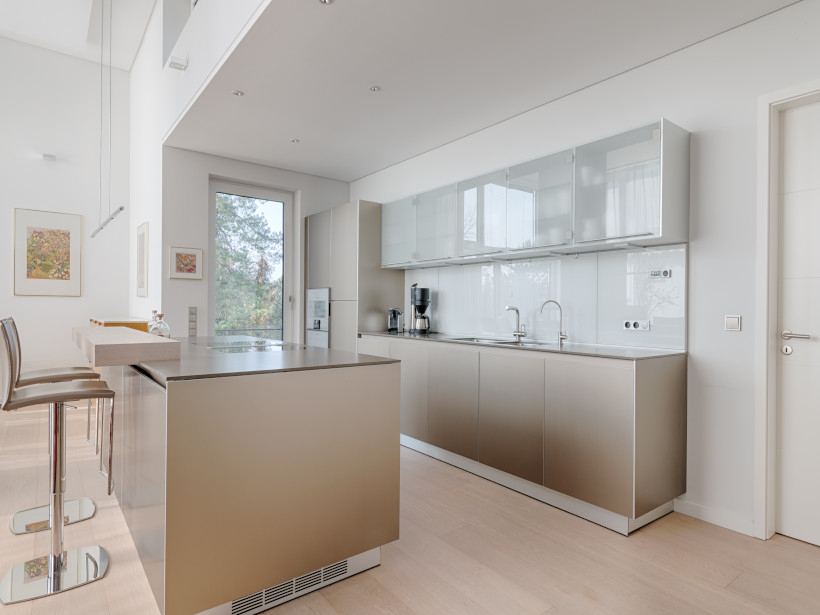 - elegante Bulthaupt Küche mit Kochinsel sowie Elektrogeräten wie Dampfgarer, Backofen, Induktionsfeld der Firma Gaggenau sowie Bora Kochfeldabzug, Geschirrspüler und Kühl-/ Gefrierkombination