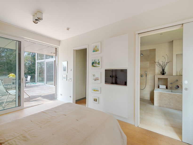 - der Schlafbereich mit Zugang zur Dachterrasse, Ankleide sowie dem angrenzenden sehr geräumigen Ensuite-Masterbad inkl. Whirlpool-Badewanne, bodentiefer Duschbereich, großem Waschbecken und WC wurde stilvoll ausgestattet und bietet somit maximalen Komfort