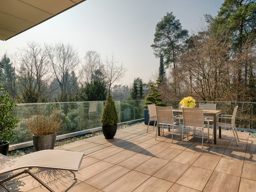 - die ca. 46 m² große, sonnenverwöhnte sowie teilweise überdachte Terrasse bietet – blickdicht zur Nachbarschaftsbebauung – eine einmalige Privatsphäre. Hier findet man Ruhe und Erholung von dem hektischen Alltag und kann die Seele baumeln lassen.