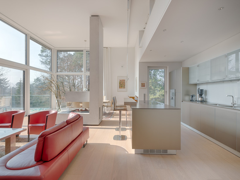 - einer Loft-Atmosphäre gleicht das ca. 68 m² große, offene Raumkonzept von Wohn-/ Ess-und Küchenbereich mit dieser außengewöhnlichen Deckenhöhe von vier Metern sowie den beeindruckenden, deckenhohen Fensterfronten, die für einen herrlichen Lichteinfall und wunderschönen Blick ausschließlich ins Grüne sorgen