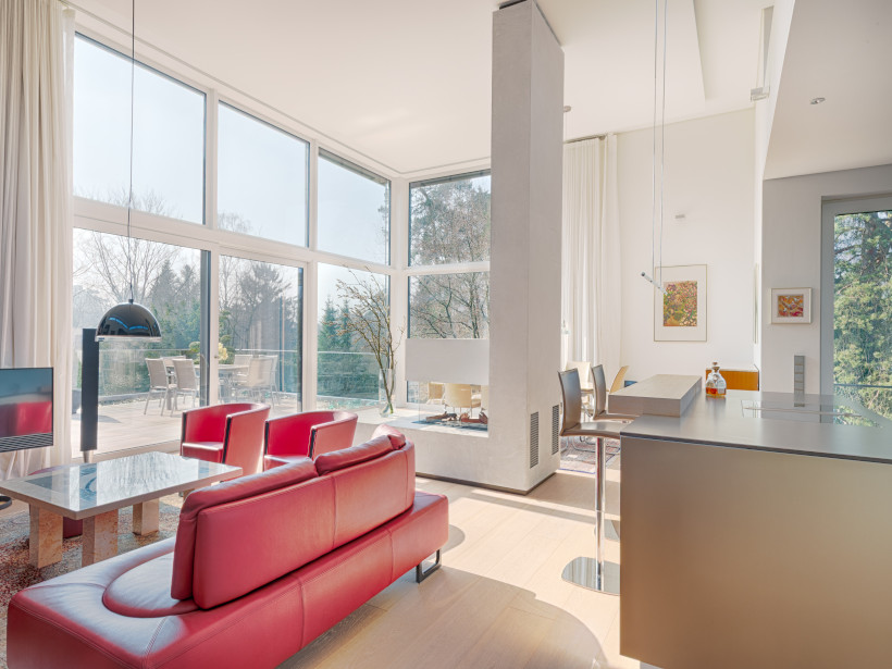 - als besonderer Blickfang und zudem Mittelpunkt und Raumteiler dieser herrlichen Wohneinheit bildet ein imposanter Panorama Gas-Kamin, der auch an grauen kalten Tagen Wärme und Behaglichkeit aussttrahlt