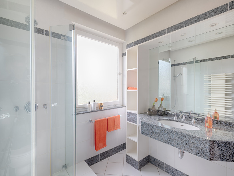 - das Duschbad im Erdgeschoss wurde in den 1990er-Jahren modern gestaltet und besticht durch zeitlose weiße Fliesen und Sanitärobjekte, harmonisch akzentuiert mit dunkelgrauen Granitplatten