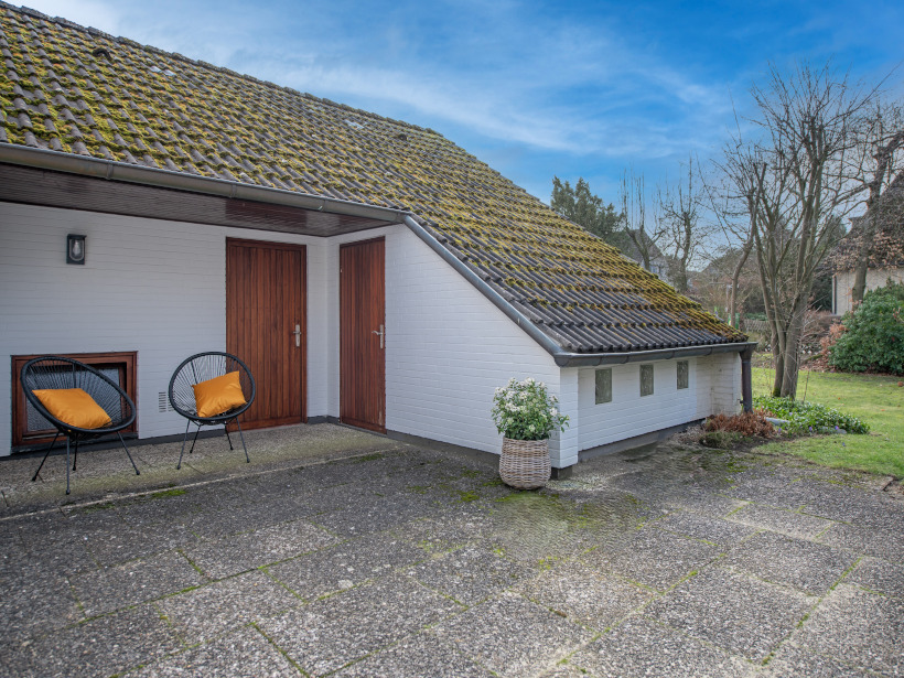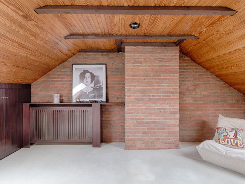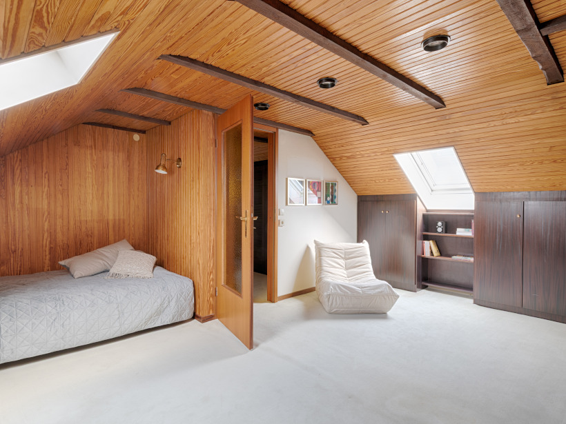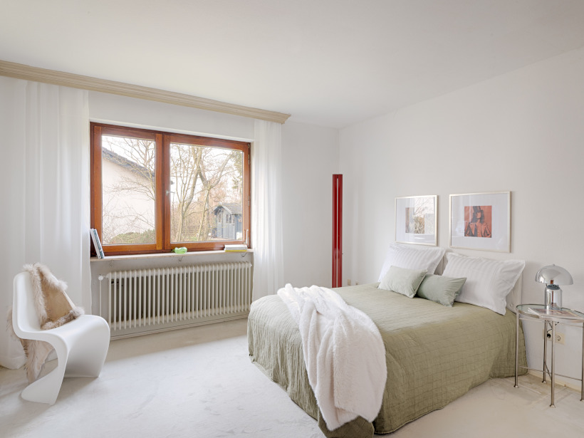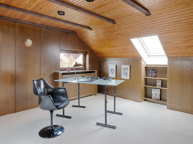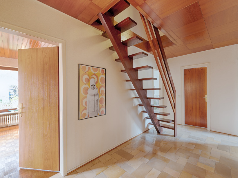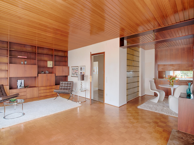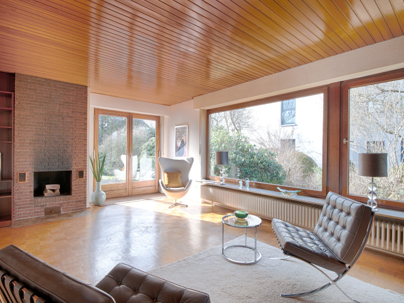Der Ausbau des Dachgeschosses erfolgte im Jahr 1978 und wurde mit hochwertigen, maßgefertigten Einbauschränken ausgestattet, die praktischen Stauraum mit zeitloser Qualität verbinden. Ein besonderer Blickfang im Haus ist die tischlergefertigte Mittelholmtreppe aus edlem Teakholz. Ihr modernes, beinahe schwebendes Design setzt einen architektonischen Akzent und verleiht dem Flurbereich eine elegante, offene Atmosphäre. Ergänzt wird der Raum durch eine Glasbausteinwand als stilvolles Designelement, die den Flur vom Essbereich trennt und gleichzeitig viel Licht in die Innenräume lässt. Von dem stilvollen Eingangsbereich aus gelangt man in das Herzstück des Hauses: den rund 41 m² großen, offen gestalteten Wohn- und Essbereich. Ein Kamin sorgt hier für eine behagliche Atmosphäre, während teilweise bodentiefe Fenster- und Türelemente sowie ein großzügiges Panoramafenster den Raum mit viel Tageslicht durchfluten und einen herrlichen Blick ins Grüne eröffnen. Die direkt angrenzende Küche ist durch eine große Durchreiche aus Holz vom Wohn- und Essbereich getrennt. Diese lässt sich mit wenigen Handgriffen öffnen, sodass bei Bedarf ein noch großzügigeres, offenes Raumgefühl entsteht. Von der Küche aus gelangt man über wenige Treppenstufen in den Hauswirtschafts- und Heizungsraum. Drei weitere Zimmer mit ca. 18 m², ca. 10 m² und ca. 7 m², ein großzügiges Duschbad aus den 1990er-Jahren sowie ein Gäste-WC ergänzen das Raumangebot im Erdgeschoss.