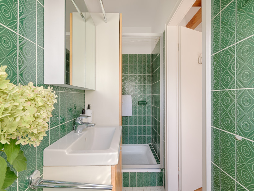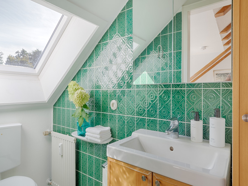 Ein kleines, lichtdurchflutetes Duschbad mit schönem Veluxfenster ist praktisch und funktional ausgestattet.